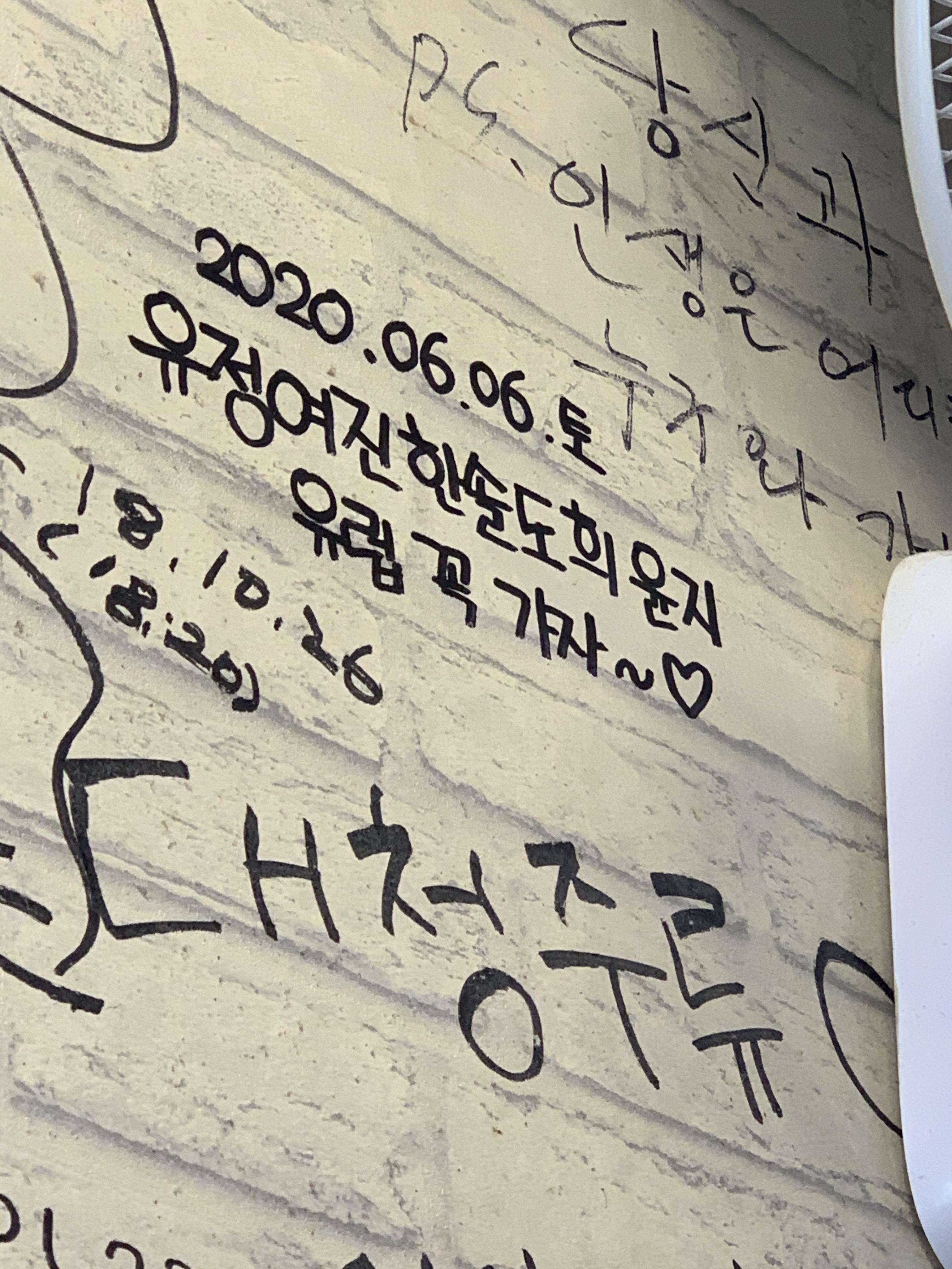 주문하고 기다림에 지쳐서 벽에 글 하나 새기고 왔다.